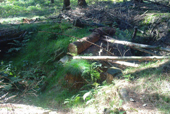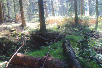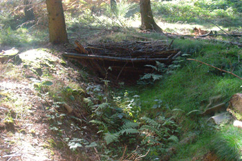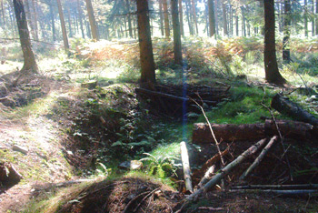 Überreste eines Erdbunkers am Rand des ehemaligen Minenfeldes "Wilde Sau" im Hürtgenwald