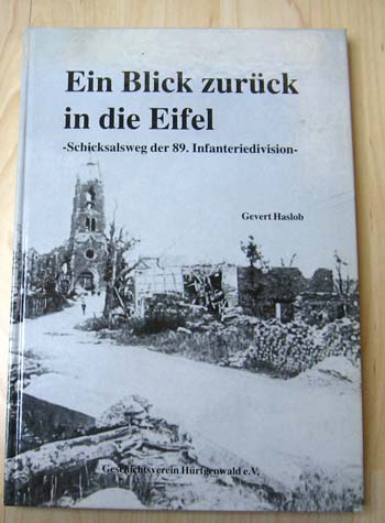Gevert Haslob, Ein Blick zurück in die Eifel, Schicksalsweg der 89. Infanteriedivision Condo-Verlag GmbH, 2000, Herausgeber: Geschichtsverein Hürtgenwald e.V. Inhalt: Einsatz an der Invasionsfront, Rückzug auf den Westwall, Kampf um den Monschau-Korridor, Die Schlacht um Schmidt, Hürtgen-Kleinhau-Brandenberg-Bergstein, Von der Schnee-Eifel Rückzug nach Remagen, Nach dem Krieg - Versöhnung über den Gräbern
