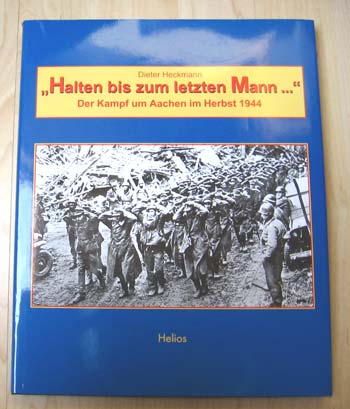 Dieter Heckmann, "Halten bis zum letzten Mann...", Der Kampf um Aachen im Herbst 1944 Helios Verlags- und Buchvertriebsgesellschaft, Aachen, 2003 Dieses Buch über die Situation in Aachen im Herbst 1944 versucht u.a. anhand von Zeitzeugenberichten sowie den Aufzeichnungen des Aachener Geschichtsvereins aus den Anfängen der 50er Jahre sowie aus amerikanischen Aufzeichnungen, dem Leser einen Einblick in die damalige Situation der Stadt und ihrer Geschichte zu vermitteln. |