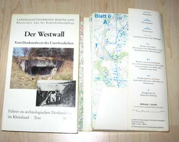Der Westwall Vom Denkmalwert des Unerfreulichen Rheinland - Verlag GmbH, Köln 1997 Bestehend aus einem Buch mit Beschreibungen von Bunkern, Panzersperren etc. und sechs Karten mit den eingezeichneten Standorten von allen Bunkern des Westwalls am Niederrhein und in der Eifel, bis in den Bereich von Losheim. |