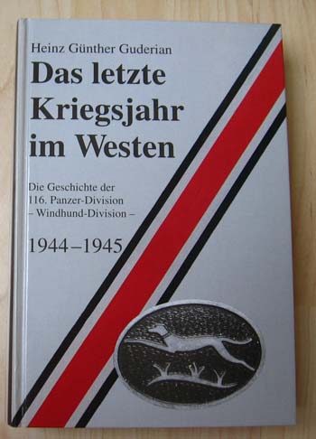 Heinz Guderian, Das letzte Kriegsjahr im Westen, die Geschichte der 116. Panzer-Division, Windhund-Division SZ-Offsetdr.-Verl., Sankt Augustin, 1997 Dieses Buch schildert die Kämpfe der 116. Panzer-Division nach der Invasion der Westalliierten in Frankreich bis zum Ende im Ruhrkessel und von Teilen im Harz. Höhepunkte sind der Gegenangriff Richtung Avranches, der Kessel von Falaise, die Kämpfe um Aachen, im Hürtgenwald, in der Ardennen-Offensive, am Niederrhein und im Ruhrkessel. |