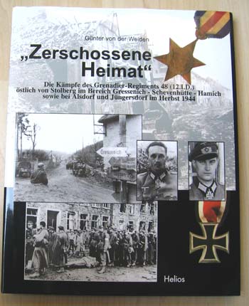 Günter von der Weiden, "Zerschossene Heimat", Die Kämpfe des Grenadier - Regiments 48 (12.I.D.) östlich von Stolberg im Bereich Gressenich - Schevenhütte - Hamich sowie bei Alsdorf und Jüngersdort im Herbst 1944 Helios Verlags- und Buchvertriebsgesellschaft, Aachen, 2004 Inhalt: Zur Lage an der Westfront bei Aachen-Stolberg vor Eintreffen der 12.Infanterie-Division im September 1944, Wiederaufstellung der 12.Infanterie-Division in Westpreußen und Verlegung an die Westfront, Gegenangriffe der 12.Infanterie-Division besonders des Grenadier-Regiments 48, Im Stellungskampf, Das Grenadier-Regiment 48 in der alliierten November-Offensive |